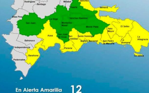 Las provincias que se encuentran en alerta amarilla son Samaná, La Romana, El Seibo, San Cristóbal, San Pedro de Macorís, Barahona, La Altagracia, María Trinidad Sánchez, Hato Mayor, El Gran Santo Domingo, Peravia y Azua. Mientras que en alerta verde están Duarte, Sánchez Ramírez, Monseñor Nouel…
