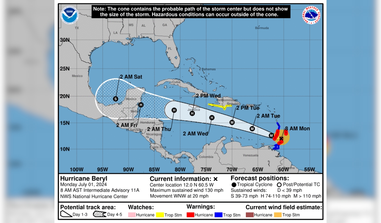 Según la ONAMET, Beryl ha descendido a la categoría 3, pero sigue siendo un poderoso huracán mayor. Actualmente, Beryl se encuentra en la latitud 11.7 norte y longitud 60.2 oeste, a unos 165 kilómetros al sur/suroeste de Barbados, Antillas Menores. Los vientos máximos sostenidos del huracán alcanzan los 195 kph y se desplaza hacia el oeste a una velocidad de 31 kph. Es crucial mantenerse atentos a la evolución y desarrollo de Beryl a través de los boletines emitidos por el Centro Nacional de Pronóstico.