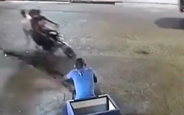 Según las imágenes captadas en el video que podemos observar, el joven se encontraba en la orilla de la acera frente a un establecimiento montado en su motocicleta, cuando de repente los dos hombres le arrebataron el teléfono.
